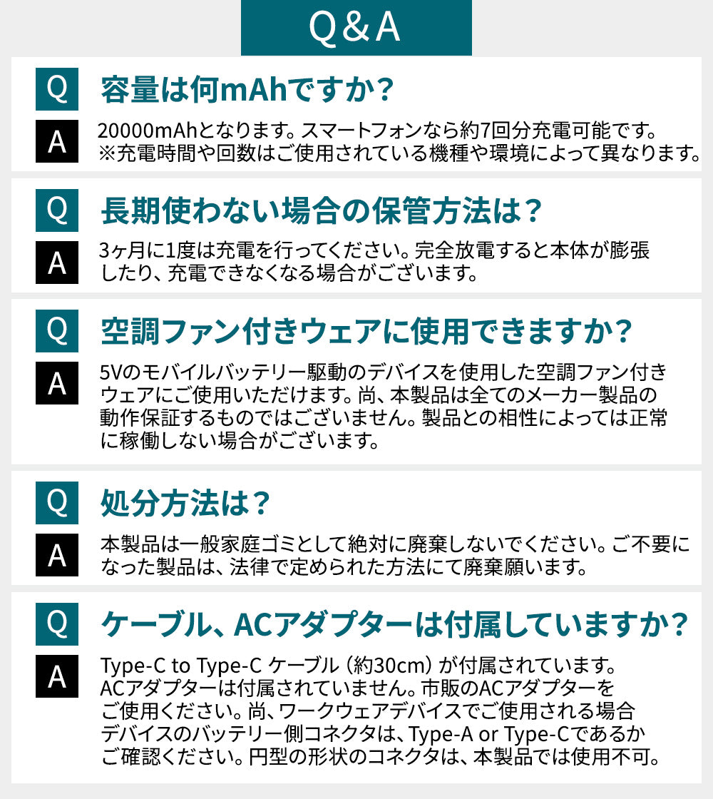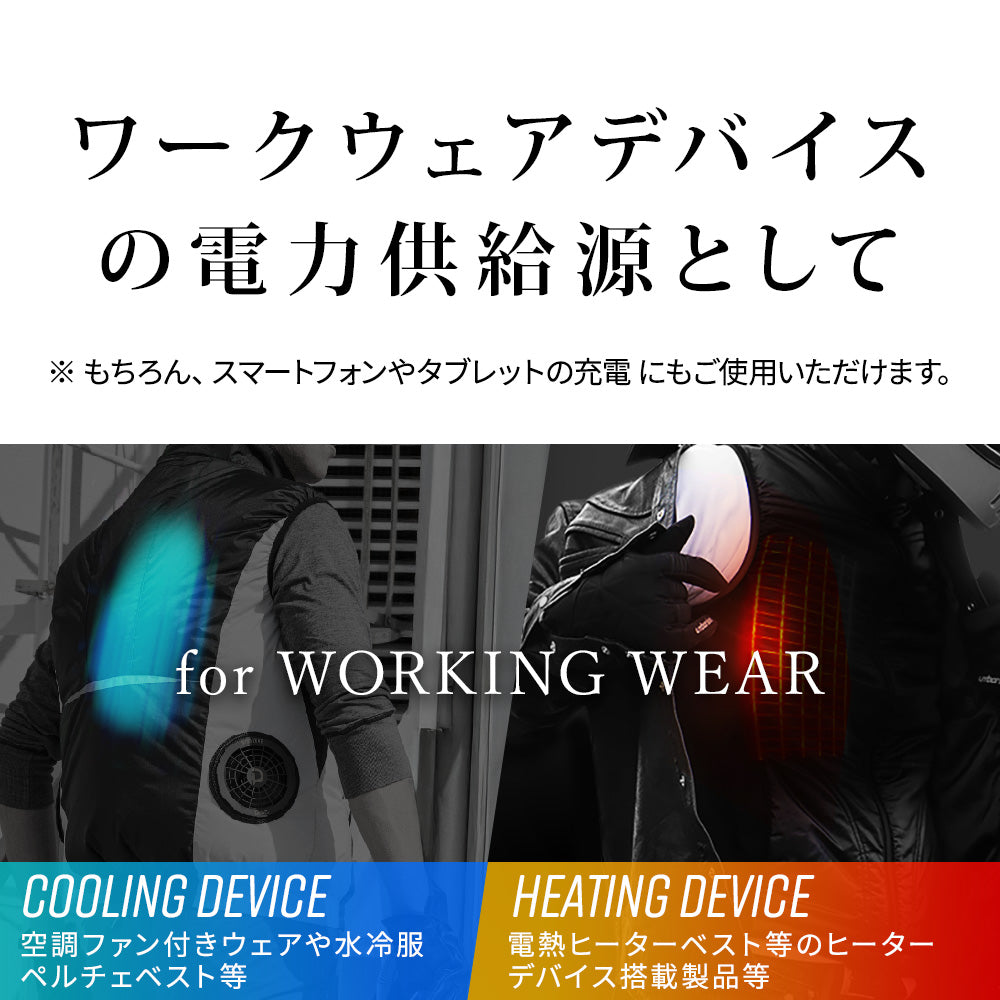 - ■5Vモバイルバッテリーで稼働するワークウェアデバイス(ペルチェベスト、空調ファン付きウェア、水冷服、電熱ヒーター製品)でご使用いただけるモバイルバッテリーです。