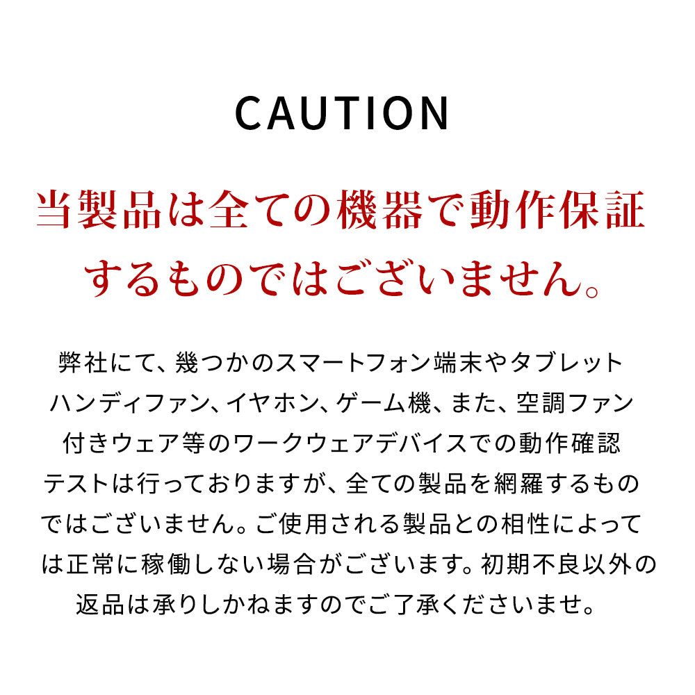 ■上記製品以外にも、空調ファン付きウェア、スマートフォンやタブレット等の充電等、多用途にご使用いただけます。(全ての機器で動作を保証するものではありません。ご使用になる機器が対応機種であることをご確認の上ご使用ください。