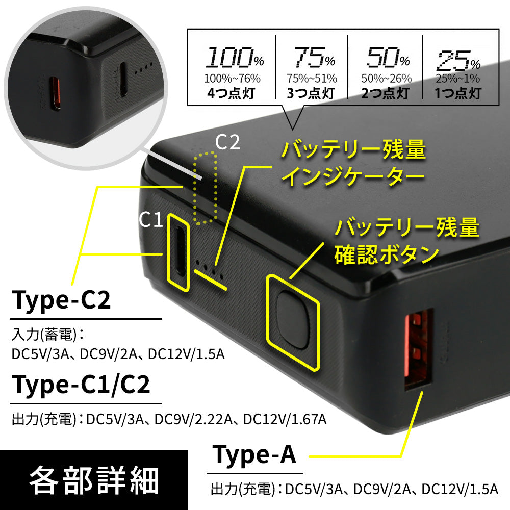 Type-C1/C2:DC 5V/3A、DC 9V/2.22A、DC 12V/1.67A(Max)
