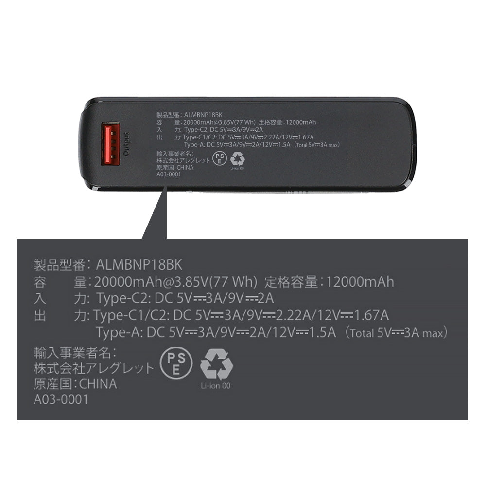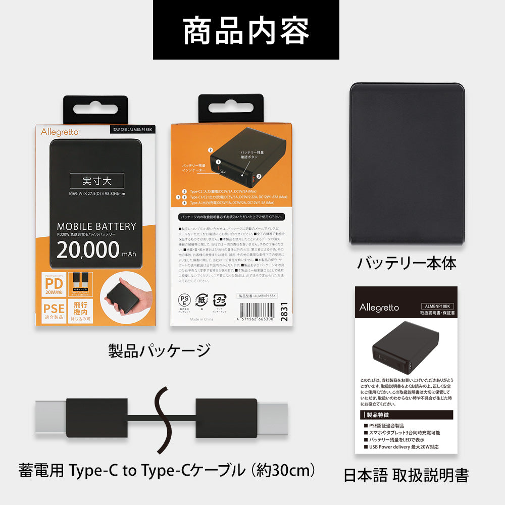 Allegretto(アレグレット)ALMBNP18BK モバイルバッテリー PD20W 急速充電 大容量 薄型 PSE認証 [5V/20000mAh/ブラック][JAN 4571562663300]