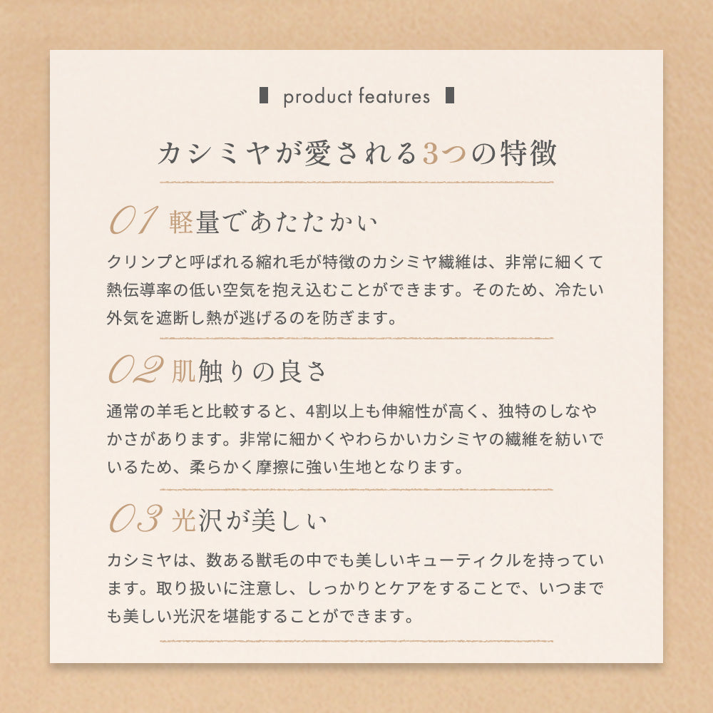 『繊維の宝石』と呼ばれるカシミヤは、保温力に優れており、とても温かな素材です。カシミヤの中でも最高峰とされる、内モンゴル産の毛を使用しております。