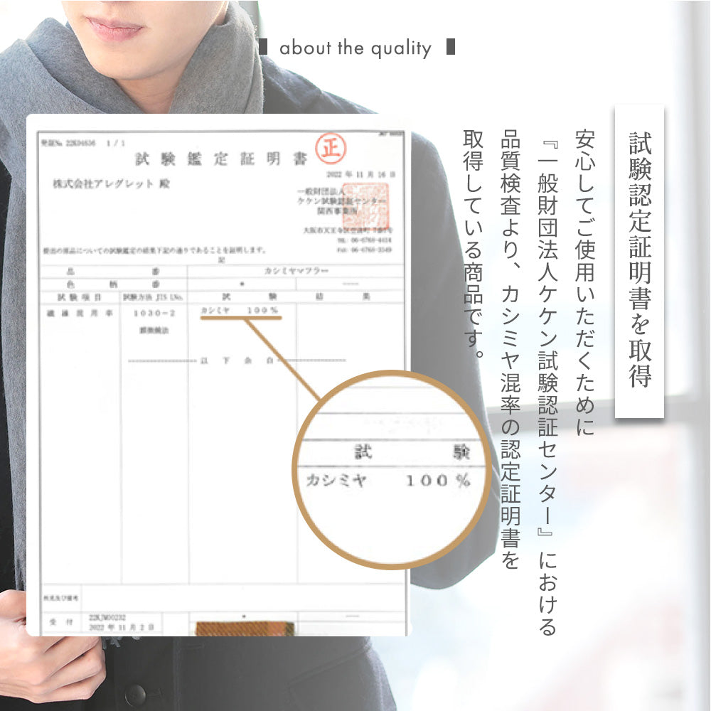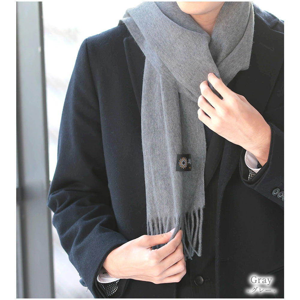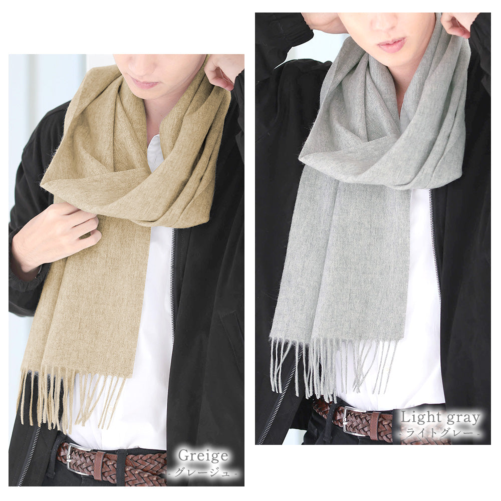 上品な光沢のあるカシミヤ100%を使用したマフラーです。定番カラーから流行カラーまで豊富なカラーバリエーションで取り揃えています。ユニセックでご使用いただけるカラーラインナップです。首元を巻くのに使い易い長さで、両端にはフリンジの付いたデザインとなります。メンズの定番のカラーをシンプルな無地のマフラーですので、普段使いからビジネスシーンまで、幅広いシーンでご使用頂けます。