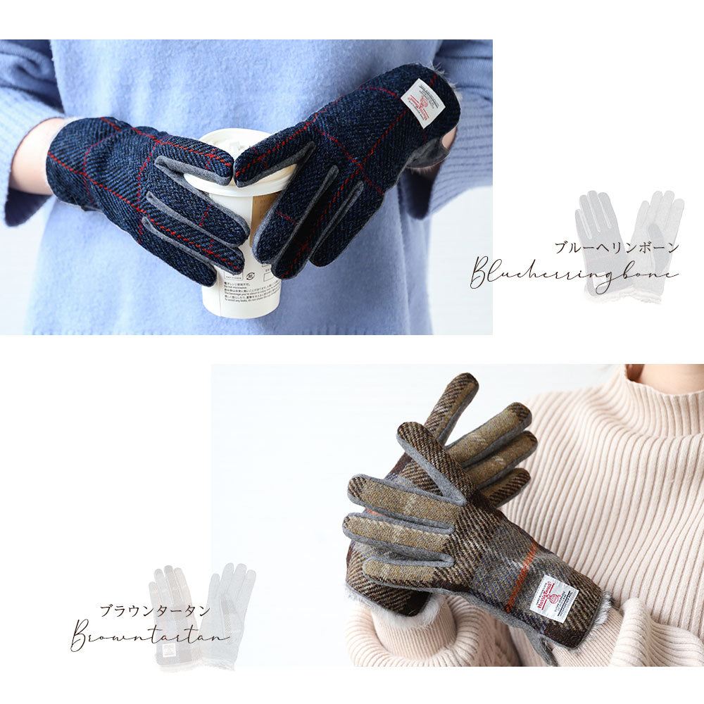英国の伝統素材であるハリスツイードと、柔らかい羊革を使用したレザーグローブです。両手の甲部分に取り付けられたオーブマーク付きのラベルは、手甲のハリス生地は本物のHarris Tweedの証。上質な素材と技術により、外観だけなく、肌触り、温かさも抜群の逸品です。レザーとツイード素材のコントラストの効いたデザインが手指を美しく見せてくれます。裏側全体には、毛足が長いベルベットを採用。ポリエステルベルベットは、コスメパフにも使われるくらい肌触りがとても柔らかく、手を温かく包み込んでくれます。タッチパネル操作が出来る様、革全体に加工を施しているので、寒い中でのスマホ操作、駅での券売機やATM操作時に手袋を外す必要がなく、利便性もあります。生産拠点の工場は、ヨーロッパのファッションシーンにもアイテムを提供しているので、手のラインを美しく魅せる技術、しっかりとした縫製に長けています。